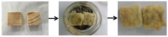 The incubator for the fungi was prepared with brown sugar and feeding wood. The brown sugar, cornflour, sawdust (30 mesh), and river sand were first put into a conical flask and stirred evenly with a weight ratio of 1:8:14:140. Then, three pieces of feeding wood and 100 mL of maltose solution were added to the flask at 121 °C for 20 min. After that, a small piece of wood-rotting fungi was taken out by an inoculating loop and placed in a bacterial incubator. The pine wood samples were placed in a conical flask containing wood-rotting fungi and stored for 12 weeks (Figure 1).