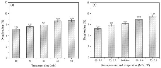 Effect of high-temperature, high-pressure steam treatment on additive loading: (a) treatment time; (b) steam pressure and temperature.