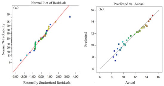 The additive loading based on the design parameters in Table 2 was also summarized in Table 2. A regression equation between the additive loading and the design parameters was built as follows: Ydrug load/% = 11.24 + 0.78A + 0.42B + 245C + 1.42D. The model’s correlation of determination R2 was 0.9462, which indicates a good fit. The high correlations between the actual and predicted values and normal probability, in which all points were close to the same line and the corresponding cumulative percentage point, was almost less than 0.6, as shown in Figure 4a,b, respectively. These indicate that the function of the variable conformed to a normal distribution, and the experimental values were similar to the predicted values obtained for the fitted model, indicating the data were reliable, and the predicted optimum exactly matched the experimental optimum.