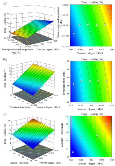 Response surface and contour analysis: (a) steam pressure, temperature, and absolute value of vacuum degree; (b) treatment time and absolute value of vacuum degree; (c) vacuum time and absolute value of vacuum degree.