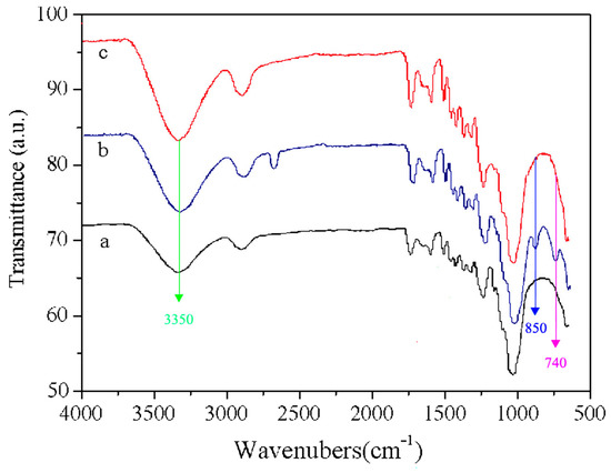 The modification mechanism of the nano-xylan treatment and heat modification on the pine wood was first examined with FTIR spectroscopy. The examined spectra for the original specimen, the nano-xylan-treated specimen, and the specimen treated with high-temperature, high-pressure steam are shown in Figure 6. Heat treatment was conducted at 170 °C and 0.8 MPa for 50 min. Compared with the spectrum of the untreated sample (Curve a), an obvious decrease in the adsorption peak at 3350 cm−1 was observed for the wood treated with steam (Curve c). The steam treatment may have released acetic acid from hemicelluloses, which then hydrolytically degraded the hemicelluloses’ chains, resulting in the formation of an ether bond and a decrease in the number of free hydroxyl groups [30]. Furthermore, new adsorption peaks at 830 cm−1 and 760 cm−1 were observed for the specimen treated with nano-xylan, which was correlated with the β-D-xylopyrose bonds (Curve b). The presence of these two bonds indicated the grafting of nano-xylan to pine wood.