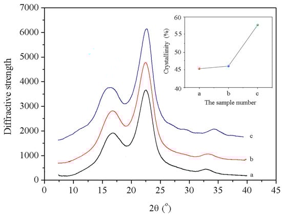 Crystallinity affects wood properties, and the influence of nano-xylan treatment and heat modification on the crystallinity of pine wood was examined with XRD (Figure 7). The treatment with high-temperature, high-pressure steam significantly enhanced the crystallinity of the pine wood. Figure 8 shows that compared with untreated pine wood, the crystallinity of the wood modified with steam significantly improved upon increasing the steam temperature and pressure. The crystallinity of pine wood increased from 47.2% to 56.8% after the heat treatment. The hydroxyl groups between the cellulose molecular chains in the semi-crystalline amorphous region of cellulose combined to form ether bonds. Then, microfibrils in the amorphous region were more orderly arranged and oriented toward the crystalline region, which increased the crystallinity of pine wood.