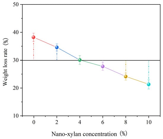 The influence of treatment nano-xylan on the integrity and mechanical performance after infection was examined. The correlation between the measured mass loss rate and the concentration of the nano-xylan is shown in Figure 9. Treatment was conducted under the optimized conditions in Section 3.2. The weight loss rate of the sample decreased upon increasing the nano-xylan concentration. Compared with the untreated sample, the mass loss rate of the sample treated with 10% nano-xylan decreased from 38 to 22%.