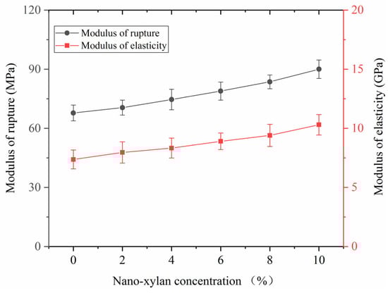 The examined strength loss for the pine wood after infection by the fungi is shown in Figure 10. The modulus of rupture and modulus of elasticity of the original samples were 106.37 MPa and 12.31 GPa, respectively. After infection for 12 weeks, the modulus of rupture and modulus of elasticity of the untreated samples decreased to 67.81 MPa and 7.36 GPa, respectively. A smaller strength loss was observed for the samples modified with nano-xylan. When the nano-xylan concentration was 10%, the modulus of rupture and modulus of elasticity of the modified pine wood after a 12-week infection remained at 89.5 MPa and 9.31 GPa, respectively. These results further support that nano-xylan modification enhanced the anti-fungal performance of pine wood.