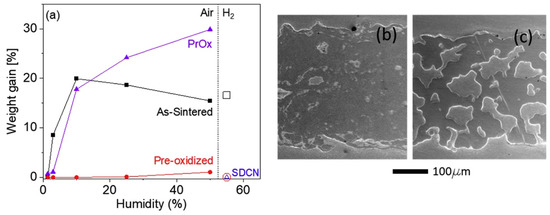 Breakaway oxidation of porous P434L stainless steel at 600 °C. (a) Humidity-dependence of the weight gain after 500 h in air (filled markers) or hydrogen/steam (open markers), for as-sintered (squares), pre-oxidized (circles), or coated (triangles) coupons. Pr6O11−x (PrOx)-coated was exposed to air and Ni/Ce0.8Sm0.2O2 (SDCN)-coated was exposed to hydrogen/steam. Note that air with humidity in the range of ~1.5% to 50% was studied, but only 55% humidity was studied for hydrogen/steam. The markers for pre-oxidized and Ni-SDC samples in hydrogen/steam overlap. SEM images of polished cross-sections of porous P434L stainless steel after oxidation for 500 h in air with 25% humidity for (b) as-sintered and (c) pre-oxidized coupons without coating [28].