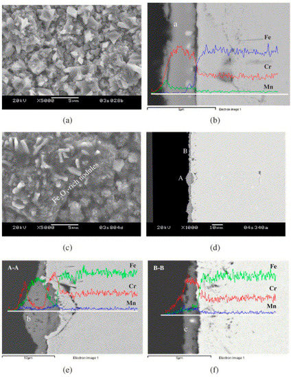 SEM observation of the scale on Crofer22 APU after isothermal oxidation at 800 °C for 300 h: (a) surface and (b) cross-section microstructures of the scale grown on the coupon exposed to moist air on both sides; (c) surface and (d) cross-section microstructures of the airside scale on the coupon simultaneously exposed to moist air on one side and moist hydrogen on the other; enlarged images from (e) area A and (f) area B in (d). The results of the EDS linear analysis on cross-sections are included [24].