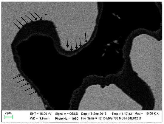 Micrograph from postmortem SEM analysis performed on the pre-oxidized MS-SOFC. The black arrows indicate the delamination between the oxide scale and the metal [48].