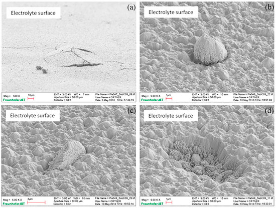 Typical electrolyte coating defects: (a) bulges and spallation, (b) nodular growth, (c) accretion growth, and (d) outburst. Note the different magnifications of (a–d) [52].