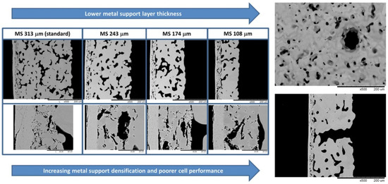 Impregnation technology is innovated based on the pore structure, surface quality, other micromorphologies of the support and impregnation parameters. The results show that the microstructure characteristics of the metal support, such as the pore size, distribution, and surface quality, have certain influences on the deposition and distribution of the impregnated layer. After impregnation, cells with open microstructures have uniform coating distributions and low surface-specific resistance at the support and functional layer [54]. Notably, to reduce the volume and weight of the cell stacks, reductions in the thickness of the support, which occupies most of the volume in MS-SOFCs, are often adopted to make the cell suitable for use in mobile applications, but this increases the densification of the cosintered support and decreases the performance. Nielsen et al. [55] have found that the cell performance can be improved by introducing gas channels by puncturing the support and increasing the porosity of the support by reducing the dwell time (Figure 8). In addition, a narrower pore size distribution makes evaporation more uniform, reduces the promoting effect of capillary force on large deposition in small pores during heating evaporation, and obtains an evenly distributed impregnation layer [56]. For insufficient capillary wetting force, vacuum treatment and solvent-assisted vacuum-free processes can help precursors impregnate pores [57]. In addition, the effectiveness of the impregnation layer depends on the surface characteristics of the metal support, affecting the quality of the initial coating and the subsequent oxidation behavior. The electronic conductivity of the alloy support is very important for promoting rapid hydro-oxidation kinetics and obtaining low-polarization-resistance coated electrode [58]. Stefan et al. considered that the surface of the clean metal support is highly hydrophobic, while the metal surface with a trace of silicon oxide pollution is hydrophilic; an appropriate impregnation treatment can be selected according to the requirements [59].