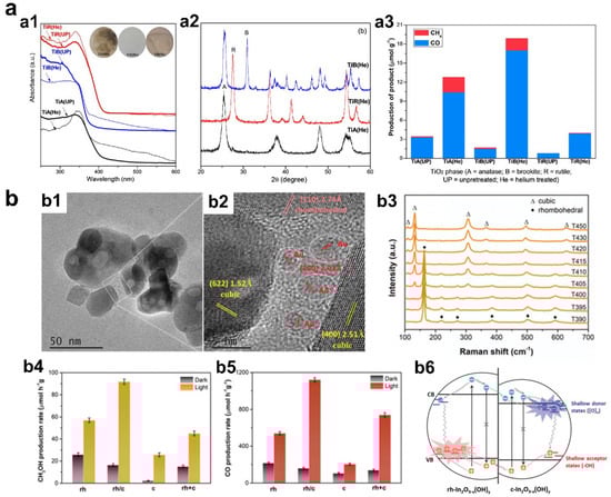 (a1) UV-visible diffuse reflectance spectra of unpretreated and He-pretreated TiO2 (anatase, rutile, and brookite). (a2) XRD patterns of He-pretreated TiO2 (anatase, rutile, and brookite). (a3) Photocatalytic CO2 reduction performance of TiO2 with different phases (copyright from ref. [70], 2012, American Chemical Society). (b1,b2) TEM and HRTEM images of ln2O3−X(OH)y composed of rhombohedral and cubic phase. (b3) XRD patterns illustrating the phase transition from rhombohedral to cubic phase with increased temperature. (b4,b5) CH3OH and CO evolution rates over the catalysts with different phase structures. (b6) Schematic illustration of charge carrier separation and recombination pathways in polymorphic heterostructures of rh/c-In2O3−x(OH)y (copyright from ref. [71], 2020, Royal Society of Chemistry).
