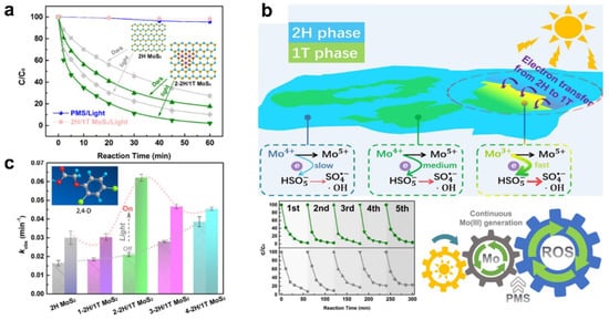 (a) Removal efficiency of 2,4-D in different reaction systems. (b) Rate constants of 2,4-D degradation using different MoS2 samples with (red dashed line) and without (gray dashed line) light irradiation. (c) Proposed mechanism for the photoinduced PMS activation on the surface of multiphase MoS2 (copyright from ref. [86], 2019, American Chemical Society).
