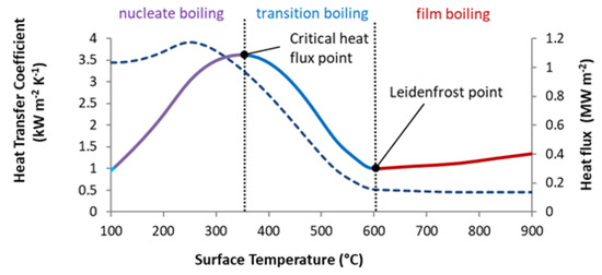 The influence of surface temperature is related to the different boiling regimes (single-phase convection, nucleate boiling, transition boiling and film boiling (Figure 1)) that occur as the hot surfaces cool [6,7]. There are two important points (temperatures) on the boiling curve (Figure 1): the Leidenfrost point (boundary between transition boiling and film boiling) and the critical heat flux point (boundary between transition boiling and nucleate boiling). The heat flux on the boiling curve is at the minimum at the Leidenfrost point and the maximum at the critical heat flux point [6]. The heat transfer coefficient is significantly lower in the film boiling regime than in the nucleate boiling regime. The Leidenfrost temperature is sensitive to the surface condition (scale, roughness), as will be shown later.