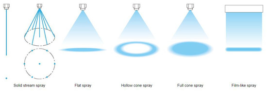 The amount of water sprayed onto the cooled surface is commonly expressed as the water mass flux ( [kg m−2 s−1]), which is commonly referred to as the impingement density [4]. Increasing the water mass flux increases the heat transfer coefficient for all surface temperatures [4,8,9]. There are different types of nozzles with different spray footprints (Figure 2). The water mass flux is influenced by the size of the nozzle (which determines the water flow rate) and the spray area (which is influenced by the distance between the nozzle and the cooled surface and by the shape of the jet). The use of nozzles allows a wide range of cooling rates to be achieved by changing the process water pressure. Increasing the water pressure increases the amount of water sprayed, which in turn increases the cooling rate. The Leidenfrost temperature and the temperature at which the critical heat flux occurs increase as the water mass flow increases [10,11].