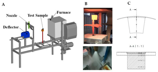 Laboratory heat treatment tests—(A): stationary spray quenching test bench [30], (B): photos of tests, (C): Schematic of test specimen with holes for thermocouples.