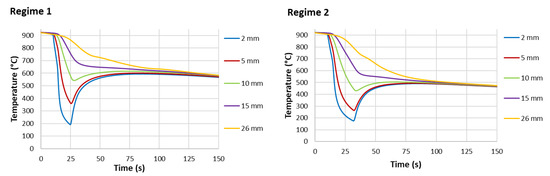 Example of measurement results for two different cooling regimes and a sample thickness of 30 mm, steel grade S355: cooling curves at different positions from the cooled surface.