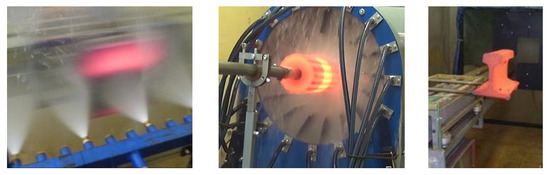 The test procedure starts with the production of a test sample of the original shape (plate, tube, rail, etc.) and the embedding of thermocouples in the test sample. In the case of a shaped product (tube, rail), the thermocouples are embedded in a similar way (smaller diameter and closer to the surface) as described in Section 2 of this paper, and in the case of a plate, holes are drilled perpendicular to the cooled surface and thermocouples with a diameter of 0.5 mm are inserted into these holes and welded just below the cooled surface. The embedded sensors are calibrated to provide reliable and repeatable heat transfer coefficient values. The sample is connected to the test bench and heated to the desired temperature (typically 900 °C). Once the cooling conditions are set, the data logger begins recording temperatures and sample position. The sample is moved reversibly through a cooling zone until it has cooled to room temperature. The maximum speed of movement on the test bench is 10 m s−1. The recorded data are then transferred to a computer for analysis.