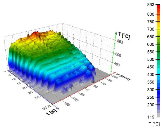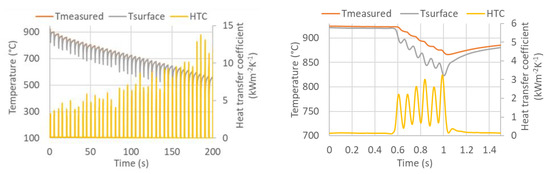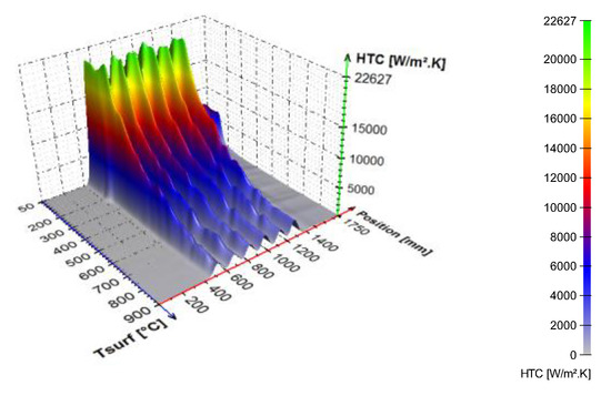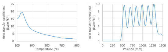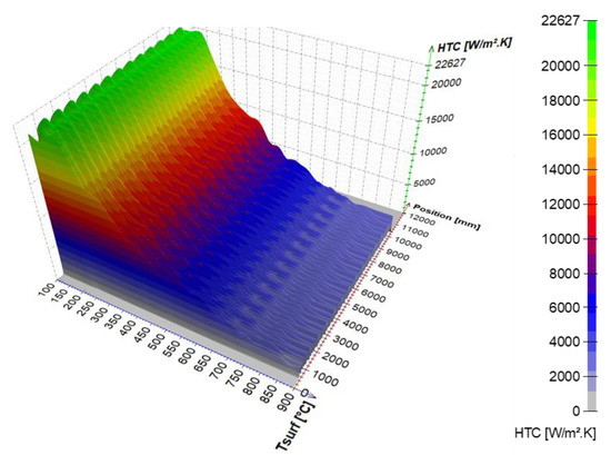 An example of the calculated time-dependent surface temperature and heat transfer coefficient is shown in Figure 13. The HTC as a function of the surface temperature and the position in the cooling section is obtained by interpolation (Figure 14). HTC as a function of surface temperature can be obtained by averaging along the position (Figure 15—left). This boundary condition can be easily applied in any commercial FEM software. The dependence of HTC on position (Figure 15—right), obtained by averaging along the surface temperature axis, can be useful for optimising nozzle positions. The dependence of the HTC on position is significantly influenced by the position of the nozzles (the main factor influencing the cooling is the water mass flux). The peaks in Figure 15 (right) are at the positions of the nozzles (maximum water mass flux) and between the nozzles, and where no water is sprayed, the heat transfer coefficient reaches its minimum. The design must take into account that a large distance between the nozzles can cause a significant decrease in the heat transfer coefficient between the nozzle positions.