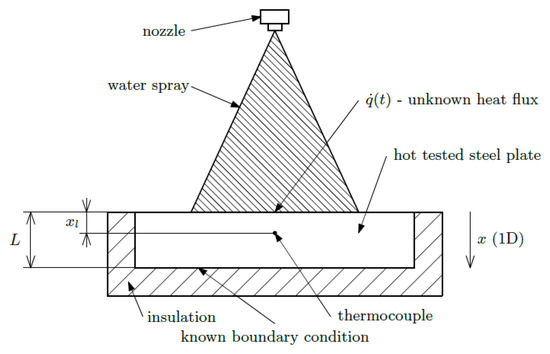 where Equation (1) is a partial differential equation of the heat conduction in one dimension (T—temperature, x—position, t—time, λ—thermal conductivity of the steel, ρ—density of the steel, cp—specific heat of the steel, L—thickness of the steel specimen, T0(x)—initial (t = 0) temperature field in the steel specimen, xl—distance between measuring point and cooled surface (x = 0), —temperatures measured by thermocouple in time steps ti, All in SI units). The scheme of the model is shown in Figure 12.