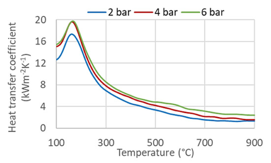 The heat transfer coefficient of the selected configuration depends on the water pressure used. An example of the effect of pressure is shown in Figure 16. The difference between two and six bars is significant for higher surface temperatures (Figure 16). The heat transfer coefficient for six bars is almost double that for two bars at 600 °C. The difference is less significant at lower surface temperatures. The cooling process of the installed cooling section can be controlled by changing the coolant pressure, especially at high surface temperatures.