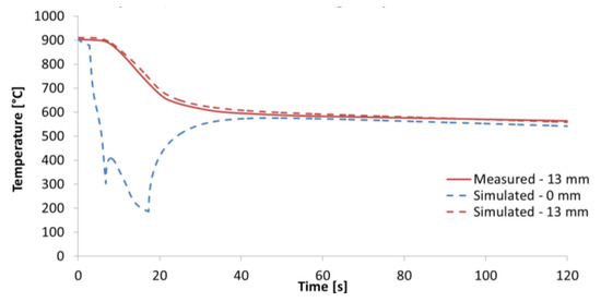 Example of measured temperatures (test bench with rotating sample) for one-sided cooling of a 20 mm thick plate of S355 steel (simulation of two-sided cooling of a 40 mm thick plate). Cooling regime: Intensive cooling—8 bar, length 16 m (4 s) and then soft cooling—4 bar, length 42 m (10.5 s), product speed 4 m s−1. Total length of cooling section—58 m (14.5 s).