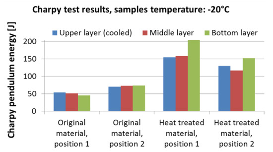 Results of Charpy pendulum tests for material S355: original material and heat-treated (regime shown in Figure 19).