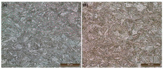 Metallographic images of the metal plates used for experimentation, made of (a) Creusabro® 8000 steel and (b) Durostat® 400 steel. Both steel grades form martensite and bainite with carbides finely dispersed in the metal (etching agent: Nital2—Magnification: 500×). This type of investigation could not reveal the small amount of residual austenite prescribed for Creusabro® 8000 steel.