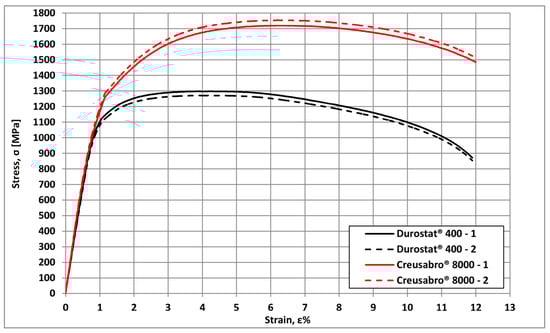 The tensile tests confirm what had been anticipated by the hardness tests. The ultimate tensile strength and yield strength of Creusabro® 8000 exceed those of Durostat® 400 steel (UTSCreusabro®8000 = 1735 Mpa; YSCreusabro®8000 = 1190 Mpa; UTSDurostat®400 = 1290 Mpa; YSDurostat®400 = 1100 Mpa). The YS/UTS ratio and percentage elongation under maximum load, Ag%, are, respectively, equal to 0.85 and 3% in Durostat® 400 and 0.68 and 5% in Creusabro® 8000. Both steels exhibit analogous values of percentage elongation after fracture (A%Creusabro®8000 = A%Durostat®400 = 11%). These values confirm another important aspect revealed by chemical analyses: Creusabro® 8000 steel’s strain hardening ability is higher than that of Durostat® 400 steel. Creusabro® 8000 is also superior to Durostat® 400 in terms of plastic deformation ability before reaching the necking point. Therefore, the Creusabro® 8000 steel exhibits superior performance compared to the Durostat® 400 steel in terms of tensile strength, hardness, and energy absorption capability. On the other hand, its weldability is poorer than in Durostat® 400.