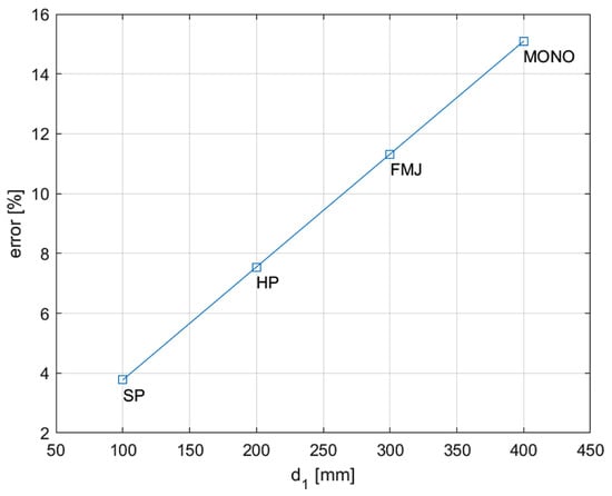 Error on position vs. observer-reference distance. The worst-case scenario is identified for the Monolithic bullets, for which the distance from the trajectory and the reference plane is 400 mm: the apparent speed in such cases is 15.1% higher than the real speed.