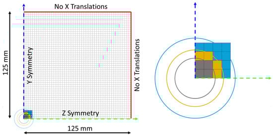 Overview (left) and detail (right) of the finite element model of the plate highlighting the choice and progressive increase in the loaded elements characterizing the three arbitrary load distributions: 100 mm2 distribution (grey), 200 mm2 distribution (yellow), and 400 mm2 distribution (light blue); the three circles represent the area-equivalent circular extensions corresponding to the minimum and maximum limit of the compression area, and the external limit of the sliding area as experimentally observed on the impacted plates, respectively (Figures 12 and 13). Only a quarter of the plate was modeled, with orthogonal symmetry conditions.