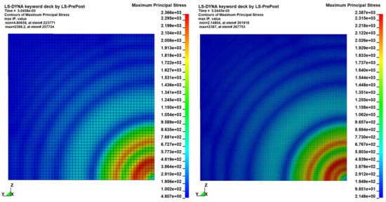 Stress field convergence. Comparison between the maximum principal stress field at 0.05 ms as predicted by the 2.5 mm model (left) and the 1.25 mm model (right). The difference in peak stress is less than 1%. No significant differences are visible. The stress wave is axially symmetric despite the squared shape of the arbitrary loaded surface.