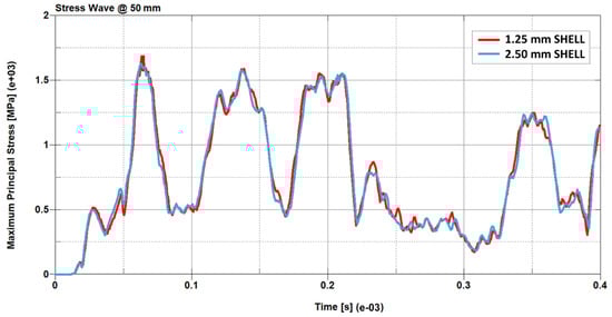Maximum principal stress waves comparison at 50 mm from the origin. The predictions obtained by the higher nodal density model (red) and by the lower nodal density model (blue) are almost impossible to distinguish, even after 0.4 ms, which corresponds to around ten times the load application time. The maximum difference in peak stress is 10% after 0.23 ms, therefore 0.19 mm after the end of the loading time. This demonstrates that the stress prediction is consistent.