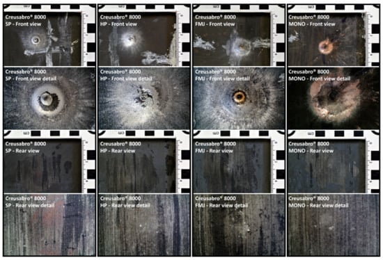 The targets were able to withstand the ballistic impacts without allowing any part of the bullets to penetrate through the 8 mm thickness. Figure 12 and Figure 13 show the effects of the impacts on the front and rear surfaces of the plates: the front views show the impact epicenter and the surrounding traces due to the radial debris deflection; the rear views show the bulges due to the residual plastic strain of the plates with no marks of penetration. It is worth noting that the Full Metal Jacket (FMJ) bullet caused the partial penetration of the first Durostat® 400 plate (Figure 14).