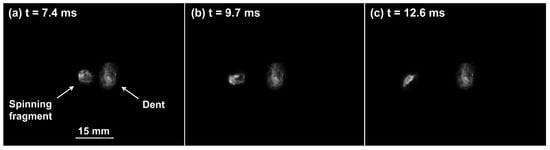 The verification of the hypotheses was performed by means of analyses of the experimental evidence. The inspection of the back plates allowed the verification of the non-penetration hypothesis. The inspection of the front plates allowed the verification of partial penetrations, here defined as the penetration of bullet material only through the front plate. The inspection of the full fragmentation of the bullets was performed by observation of the frames collected by means of the two high-frame-rate cameras in order to verify the gradual fragmentation of the bullet during the impact, the overall axial symmetry of the deflection kinematics, and the absence of major fragments rebounding from the plate and/or showing dimensions comparable with the bullets. A fragment was considered major if showing dimensions comparable with the calibre of the bullet. The presence of major fragments adhering to the impact surface was also verified by inspecting the plates.
