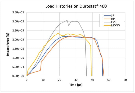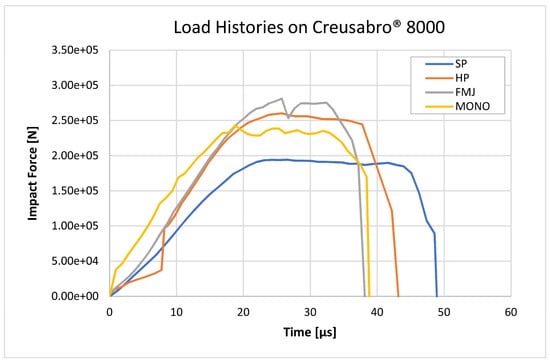 To estimate the load-history due to bullet-splash of the tested impactors the formula (Equation (8)) was applied to the bullets section (Figure 1) by imposing an impact speed equal to those experimentally measured for the tested impacts.