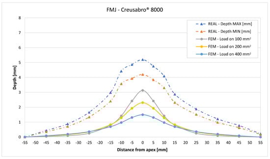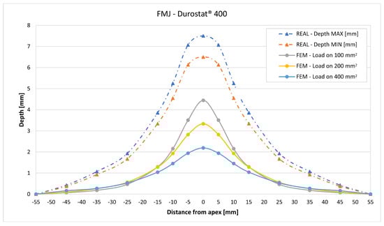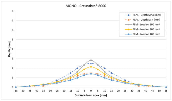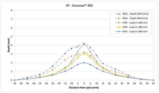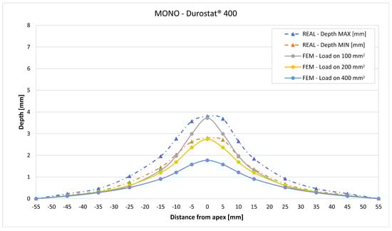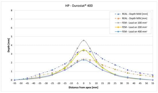 The validation in slope at 50 mm from the apex in most of the cases increases from the sharpest to the intermediate distribution and then slightly decreases or remains constant for the flattest: the 100 mm2 gives an average validation of 54% on Durostat® 400 and 85% on Creusabro® 8000, while the 200 mm2 distribution gives 66% on Durostat® 400 and 97% on Creusabro® 8000. The 400 mm2 gives 66% on Durostat® 400 and 90% on Creusabro® 8000. The increase and slight decrease with the extension of the loaded areas is explained by the opposite effects of reducing the load intensity, which decreases the bulge volume, and reducing the average distance from the load application to the peripheral area where the slope is calculated, which tends to increase the peripheral deformation.