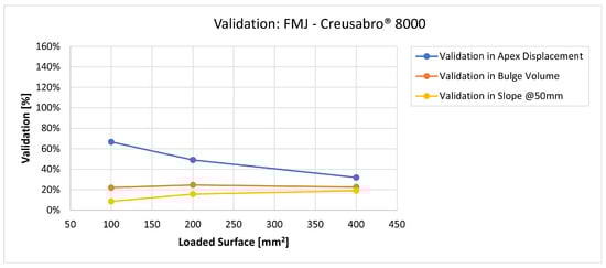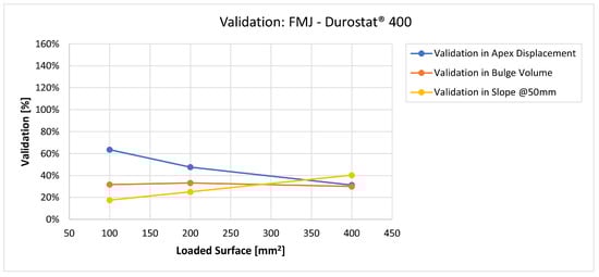 Validation for FMJ on Durostat® 400: validation of the calculated residual displacement fields in terms of apex displacement (blue), total bulge volume (red), and slope at 50 mm (yellow). In abscissa the loaded area of the three arbitrary distributions. In terms of apex displacement, the 100 mm2 distribution gives the best estimation (63%), while the 200 mm2 and 400 mm2 give 48% and 30%. The three distributions provide consistent predictions in terms of bulge volume around 30–33%. In slope, the estimate increases as the distribution area, from 17.5% to 40%.