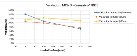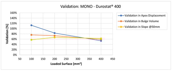 Validation for MONO on Durostat® 400: validation of the calculated residual displacement fields in terms of apex displacement (blue), total bulge volume (red), and slope at 50 mm (yellow). In abscissa the loaded area of the three arbitrary distributions. In terms of apex displacement, the 100 mm2 distribution gives the best estimation (113%), while the 200 mm2 and 400 mm2 give 83% and 54%. The bulge volume predictions decrease from 76% to 63% as the area increases. The slope predictions are more consistent, between 57% and 67%.