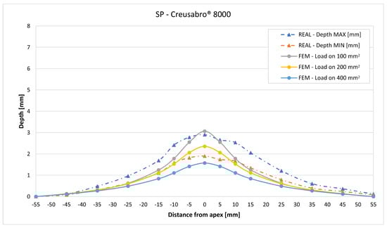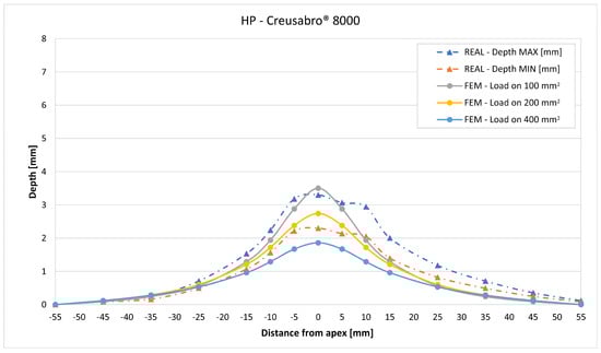 The validation graphs (Figure 20, Figure 22, Figure 24, Figure 26, Figure 28, Figure 30, Figure 32 and Figure 34) demonstrate that the estimated load histories applied on the 100 mm2 and 200 mm2 distributions allow correct predictions of the residual displacements at the apex for all the verified bullet splashes (SP, HP, and MONO), with the sharpest distribution giving percentage validations between 109% and 157% (average 126%) on Durostat® 400 and between 125% and 141% (average 131%) for Creusabro® 8000. Moreover, the 200 mm2 distribution gives representative validations between 82% and 119% (average 95%) on Durostat® 400 and between 98% and 107% (average 101%) for Creusabro® 8000. It is crucial to notice that even though the two sharpest distributions have a 100% difference in pressure intensity and loaded surfaces, the average difference in the estimations of the maximum residual displacement between the two is limited to 31% (129% vs. 98%). Even the 400 mm2 distribution gives an average validation in apex displacement of 65%, despite a pressure field intensity equal to 25% of the one imposed by the sharpest distribution.