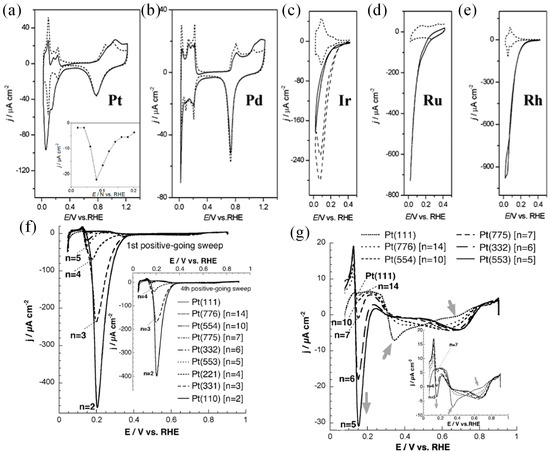Cyclic voltammograms on (a) Pt, (b) Pd, (c) Ir, (d) Ru, and (e) Rh in 0.5 M H2SO4 with (solid line) or without (dashed line) the presence of 0.1 M NaNO3. Inset in (a) is the steady-state NO3− reduction current at different potentials [20]. (f) Cyclic voltammograms at Pt(1 1 1) and Pt(S)[n(111) × 111]] electrodes (n = 14, 10, 7, 6, 5, 4, 3, 2) in 0.1 M 10 mM KNO3 + HClO4. (g) The cyclic voltammograms of the expansion of current density scale of (f) [42].
