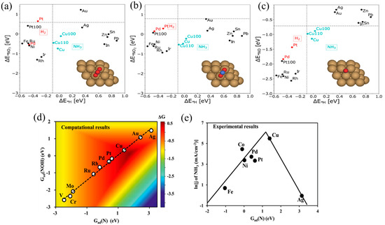 The adsorption energies of the intermediates (a) ; (b) and (c) corresponding to ΔE*H [55]. (d) A two-dimensional activity map for producing NH3, where all the reaction free energies are shown at 0 V vs. RHE [12]. (e) The logarithm of partial current density of NH3 for NORR on different metal electrodes at 0 V vs. RHE [56].
