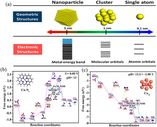(a) Schematic diagrams of the geometric structures and electronic structures of single atoms, clusters, and nanoparticles [58]. Free energy diagrams of the electrochemical NO3−RR to NO2−/NH3 on (b) Cu-N3 and (c) Cu13 sites [61].
