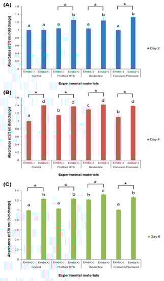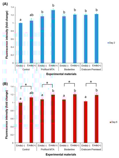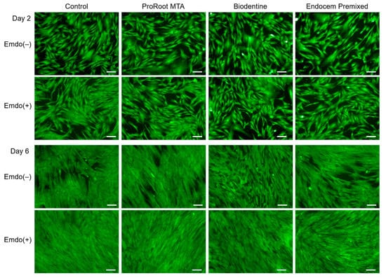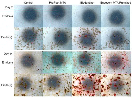 - Youssef, A.R.; Emara, R.; Taher, M.M.; Al-Allaf, F.A.; Almalki, M.; Almasri, M.A.; Siddiqui, S.S. Effects of mineral trioxide aggregate, calcium hydroxide, Biodentine and Emdogain on osteogenesis, odontogenesis, angiogenesis and cell viability of dental pulp stem cells. BMC Oral Health 2019, 19, 133. [Google Scholar] [CrossRef] [PubMed]
