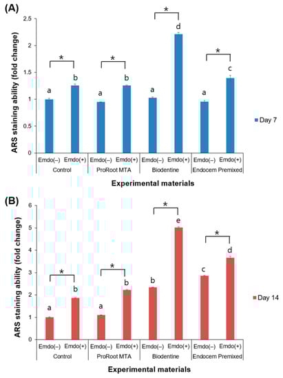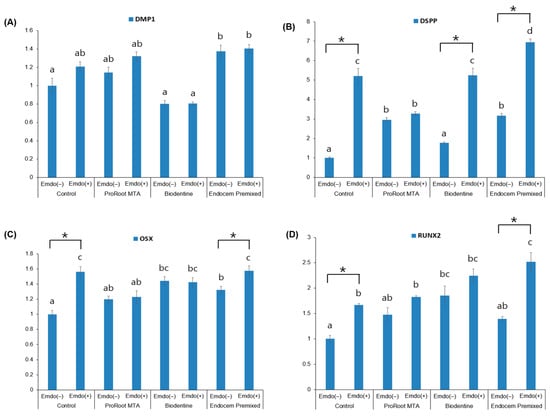 - Chang, S.W.; Lee, S.Y.; Kum, K.Y.; Kim, E.C. Effects of ProRoot MTA, Bioaggregate, and Micromega MTA on odontoblastic differentiation in human dental pulp cells. J. Endod. 2014, 40, 113–118. [Google Scholar] [CrossRef]