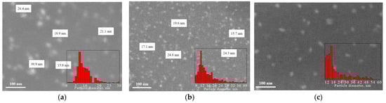 The structures of the CDs were studied using SEM. To perform this, CDs from the solution were deposited on silicon substrates and dried in air atmosphere. Figure 1 shows SEM images of CDs synthesized from CA, glucose, and birch bark soot and their size distributions (insets). It was shown that the forms of the CDs synthesized from different precursors were different. Carbon dots from CA and glucose are round and well dispersed, with an average size of ~7 nm (CDs from citric acid) and ~11 nm (CDs from glucose). During the synthesis of CDs from glucose and CA, CDs are formed by the “bottom-up” method from carbon atoms in a highly carbonized aqueous solution. In solution, the process of self-assembly of carbon atoms occurs, which leads to the appearance of graphene sp2 planes. CDs from soot have round (~16 nm) or elongated (~16 × 6 nm) shapes. This may be because the CDs from soot are located differently on the surface of the SiO2/Si substrate. In contrast to the CDs from CA and glucose, CDs from soot are obtained by splitting large fragments of soot. Perhaps in this case, the CDs’ cores had graphite structures. It was found that the type of precursor affects the size and shape of the CDs, and there is also an influence of the CD assembly method.