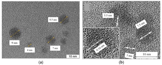 Figure 2 shows the TEM images of the CDs from CA. As shown, the shapes of the obtained CDs are round, with an average diameter of ~7 nm (Figure 2a). High-resolution TEM images (Figure 2b) illustrate ~15 stripes on the CDs, and the distance between them is observed at 0.34 nm. Despite the fact that the distance between graphene nanoplates is 0.34 nm, in our opinion CDs do not have a graphite structure since it is known [31] that graphite lattice strongly quenches luminescence. Such stripes in CDs are also observed in other studies, in which the distance between the strips varies in the range from 0.21 nm to 0.34 nm [5,11,25,31,32].