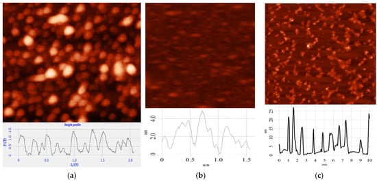 The thicknesses of the CDs were measured using AFM. As shown in Figure 3, the average thickness of CDs from CA is ~2 nm (Figure 3a) and that from glucose is ~4 nm (Figure 3b). For CDs from soot, the thickness varied from 6 to 20 nm (Figure 3c).