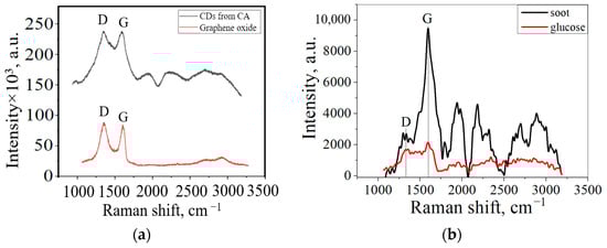 Raman spectra of (a) CDs from CA and GO; (b) CDs from soot and glucose.