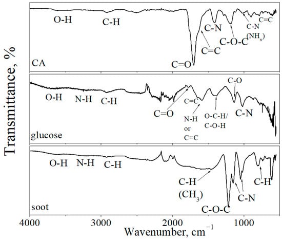 FTIR spectra of CDs from CA, glucose, and soot.