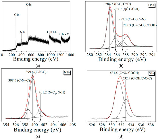 The N1s spectra (Figure 6 c) mainly consist of three peaks: pyridine nitrogen (C–N=C) (398.1–399.3 eV), pyrrole nitrogen (C–N–C) (399.5–400.2 eV), and an amide group (graphitic nitrogen) N–C3/N–H (401.7–402 eV). The O1s spectrum peaks at 531.5 eV and 532.9 eV could be assigned to C=O/–COOH and C–OH/C–O–C [19,40] (Figure 6d). XPS analysis confirmed the data obtained with IR in the presence of oxygen and nitrogen-containing functional groups in the CDs.