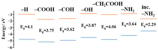It is known [41] that functional groups introduce a number of discrete levels into the energy gap of CDs. The levels associated with the presence of functional groups were calculated. The calculation was carried out according to density functional theory (Becke, 3-parameter, Lee-Yang-Parr hybrid functional, using the VWN1 correlation—Vosko, Wilk, and Nusair) [42]. Figure 7 shows that the functional groups introduced a number of local levels into the CDs’ energy system, which possibly participated in the radiative transitions of electrons that caused luminescence.